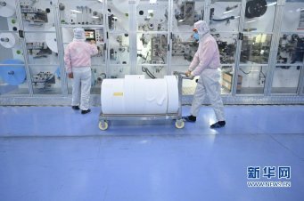 1月27日,在福建泉州石狮一家口罩生产企业的十万级无尘车间,工人在运送口罩生产原...