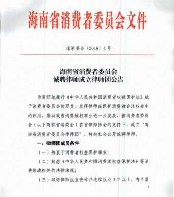 [通知公告] 海南省消费者委员会关于诚聘律师成立律师团...  日期:2021-04-16 12:42:36