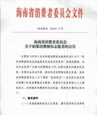 [通知公告] 海南省消费者委员会关于招募消费维权志愿者...  日期:2021-04-16 12:42:59