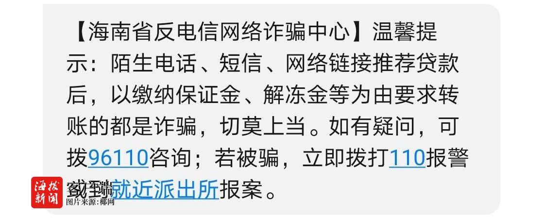 近日,连续有市民网友遭遇“短信贷款”诈骗,涉及金额高达数万元。对此,3月29日,海南省反电信诈骗网络中心发布短信防诈提醒,陌生电话、短信、网络链接推荐贷款后,以缴纳保证金、解冻金等为由要求转账的都是诈骗,切莫上当。