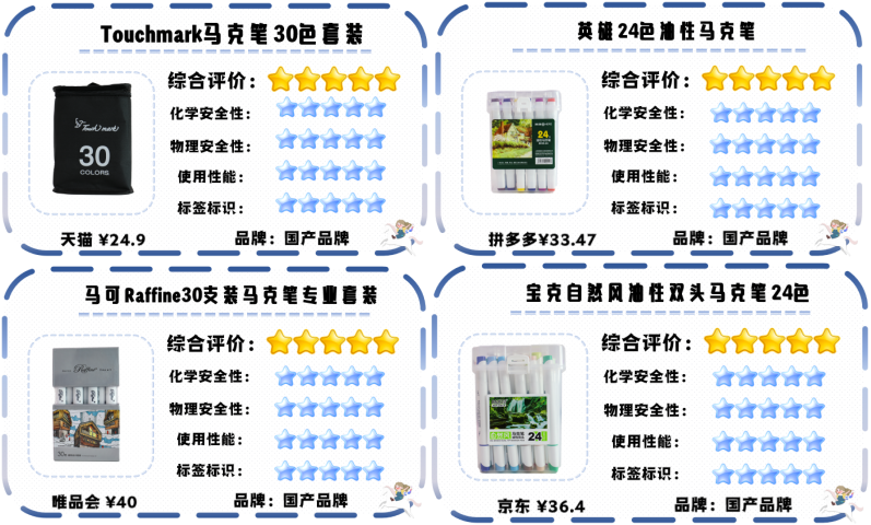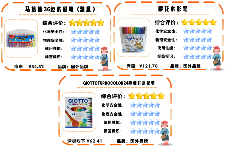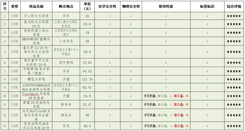 本次比较试验站在消费者视角,针对消费者关注的化学安全性、物理安全性、标签标识、使用性能等问题,参照国家标准及欧盟标准对水彩笔、马克笔开展比较测试并进行分级评价,以更多更严的标准为消费者提供正确的消费信息、消费指导。    一、测试指标设定原则:更多更严当前水彩笔、马克笔产品主要执行的标准有强制性国家标准GB 21027-2007《学生用品的安全通用要求》、轻工行业标准QB/T 2777-2015《记号笔》,两项标准暂未对消费者高度关注的安全问题如防腐剂、邻苯二甲酸酯类以及多环芳烃等进行相关要求。本次比较试验遵循以下两个原则,选取国内相关标准以及国际一流标准进行检测,满足消费者品质消费需求。    原则一:更多。综合国家标准、欧盟标准选取项目指标数量更多的标准进行测试。如:针对特定元素迁移,本次在国标8种特定元素迁移基础上采用指标数量更多且限制更严的欧盟标准对19种特定元素迁移进行测试。    原则二:更严。根据国家标准、欧盟标准选取项目指标限值更严或国内无要求的标准进行测试。如:国内水彩笔、马克笔相关标准对邻苯二甲酸酯类、多环芳烃、防腐剂暂无要求,本次比较试验根据水彩笔、马克笔材质特点,引入指标数量更多且限制更严的欧盟标准对邻苯二甲酸酯类、多环芳烃、防腐剂含量进行测试。    二、分级评价标准,接轨国际通行做法    通过标准的对比发现我国水彩笔、马克笔标准中安全要求、安全性能应控制的范围及安全限量存在一定滞后。因此,充分听取业内专家、检测机构、企业及消费者意见后,综合国家标准、国家行业标准和欧盟标准本着从严要求选取安全性更高的指标制定了本次儿童文具(水彩笔、马克笔)比较试验测试指标。    根据《中共中央 国务院关于开展质量提升行动的指导意见》中“建立质量分级制度,引导完善第三方质量评价体系”的要求。按照国际消费者组织通行的分级评价标准开展本次比较试验,“★”越多结果越好,同星级样品排名不分先后。    三、9款水彩笔、10款马克笔品质领跑,国产品牌占15款    根据国务院办公厅印发《消费品标准和质量提升规划(2016-2020年)》(国办发[2016]68号)“建立企标领跑者制度,引导消费者更多选择标准领跑者产品”的要求。为营造“生产看领跑,消费选领跑 ”的氛围,根据比较试验相关规则评选出19款符合本次比较试验制定的更多更严标准要求品质领跑的水彩笔、马克笔,分别是:齐心软头水彩笔、晨光软头水彩笔24色、爱好抗菌三角水彩笔、BRAVOKIDS童趣水彩笔、富乐梦12/24色-细长双头水洗彩色笔、Touchmark马克笔30色套装、英雄24色油性马克笔、马可Raffine30支装马克笔专业套装、宝克自然风油性双头马克笔24色、塔奇酷马克笔学生30色、得力彩色马克笔、晨光双头马克笔、西瓜太郎马克笔-24色双头、掌握双头马克笔动漫色系、真彩双头马克笔、樱花水彩笔、GIOTTOTURBOCOLOR24色细杆水彩笔、美乐童年可水洗水彩笔-24、马培德36色水彩笔(塑盒)。     四、比较试验结果