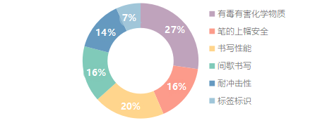 4. 有毒有害化学物质是消费者最关心的测试项目,占比27%。其次为书写性能,占比20%。