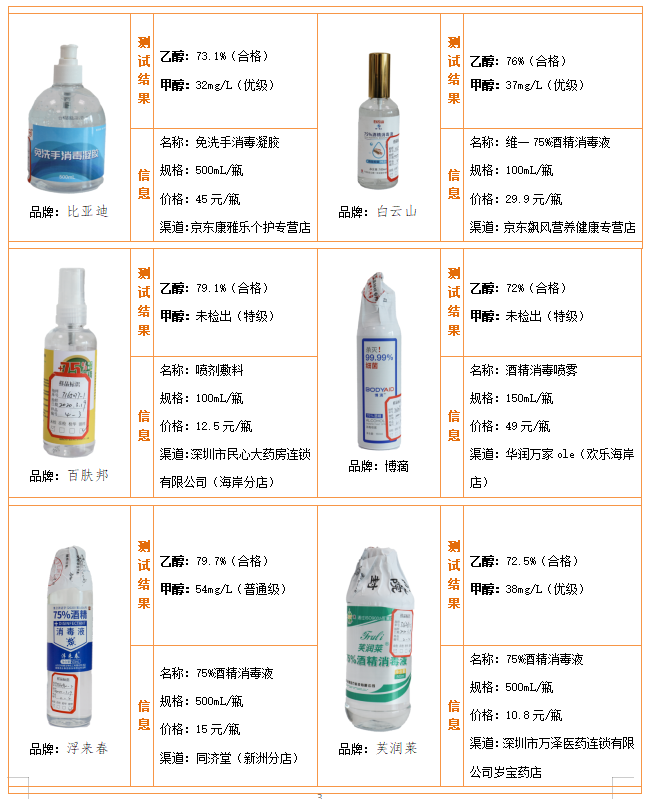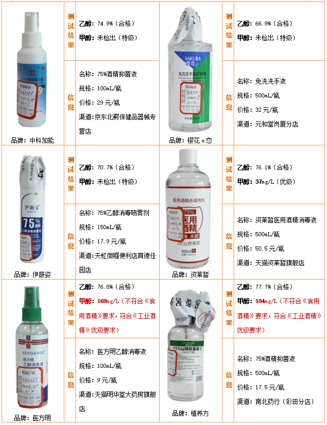 1. 本次比较试验所有样品均由工作人员以普通消费者身份通过正规销售渠道购买。结果仅供消费者选购产品参考,不构成对任何相关产品的推荐与宣传。 2. 乙醇含量参照GB/T 26373-2010《乙醇消毒剂卫生标准》或产品标签明示含量进行要求。甲醇的含量参照GB 10343-2008《食用酒精》“≤2mg/L(特级)、≤50mg/L(优级)、≤150mg/L(普通级)”GB/T 394.1-2008《工业酒精》“≤800mg/L(优级)、≤1200mg/L(一级)、≤2000mg/L(二级)、≤8000mg/L(粗酒精)”进行要求。 3. 警示产品为乙醇含量不合格或甲醇含量既不符合《食用酒精》标准要求也不符合《工业酒精》标准要求。 4. 以上列表排名不分先后;本次比较试验结果仅对所购买的样品负责,结果仅供消费者参考,不代表同品牌不同批次、不同规格产品的质量状况,不构成对相关产品的推荐与宣传。 5. 未经深圳市消委会书面允许,任何单位和个人不得擅自使用本次比较试验结果作为商业宣传。 一、项目背景 一场突如其來的新冠疫情让“75%酒精”成为各大购物平台的热搜词,也成为每家每户必备的消毒用品之一。你是否担心乙醇含量不达标起不到消毒作用?是否担心甲醇含量超标会给人体健康带来较大危害?因此,为进一步了解醇类消毒液产品的质量状况,指引消费,深圳市消委会开展了线上线下含醇消毒液(含洗手液)比较试验,。本次比较试验检测工作委托深圳市计量质量检测研究院进行。 二、比较试验详情 (一)样品来源 本次比较试验样品均为市消委会工作人员模拟消费者从线上线下共计购买50款样品。其中线下连锁药店、便利店、超市等渠道购买31款样品;线上京东、天猫、苏宁易购、唯品会等渠道购买19款样品。