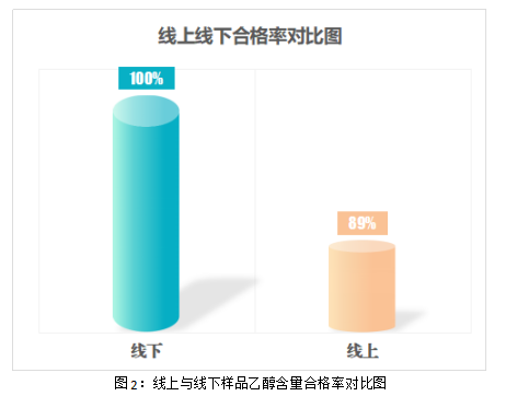 50款样品中有2款样品乙醇含量不合格。标注商标为“药益舒”样品乙醇含量仅为47.7%(体积比);标注商标为“简通达”样品乙醇含量仅为37.6%(体积比),不符合GB/T 26373-2010《乙醇消毒剂卫生标准》70-80%(体积比)之间的标准要求,且检出甲醇含量每升高达305000毫克,不符合GB 10343-2008《食用酒精》的标准要求,为该标准对普通级食用酒精中甲醇含量要求的2033倍,为GB/T 394.1-2008《工业酒精》对粗酒精要求的38倍,存在严重的质量安全隐患。