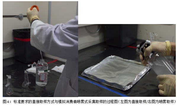 (二)醇类消毒液经过喷嘴喷出后,由于酒精挥发等原因,其乙醇含量普遍低于标准“75%±5”要求。 测试方法要求直接打开瓶盖取适量的酒精进行检测。为验证经过喷嘴喷出来的乙醇含量是否达标,实验室还模拟消费者喷雾消毒的方式进行取样测试。对31款具有喷雾装置样品,罐中的乙醇含量和喷雾后的乙醇含量,进行对比检测。结果显示:在罐中乙醇含量均符合标准要求,符合率为100%;喷雾后乙醇含量普遍低于标准的要求,仅11款样品喷雾后乙醇含量符合标准要求,符合率为35.5%。造成乙醇含量下降的主要原因是因为醇类消毒液经过喷头雾化后乙醇含量在空气中迅速挥发,造成可收集有效成分下降,导致乙醇含量不足。