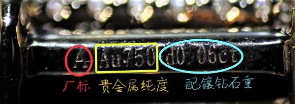 三识克拉重,如果是镶嵌类首饰还会多一步——镶嵌宝石的印记。镶嵌钻石首饰,主钻石重在0.1克拉以上,要刻石重印记。(如图示3,钻戒上“D0.130ct”印记,说明其主钻石重量是0.13克拉,“d0.06ct”说明其配镶钻石总重为0.06克拉 )。